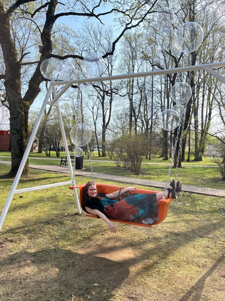 “Mana bērnība nav iedomāja bez Liepājas Karotas sajūtām. Pagrabiem, ielām, štābiņiem un atrasto mantu laboratorijas, kas atvēra manu radošumu. Katra bērnības lieta ir ar stāstu. Atrastās monētas, pogas, sprādzes un detaļas bija kā metamais kauliņš, kuru uzmetot mēs nezinām, kāds cipars paliks uz augšu. Tāpat es nezināju, kādas lietas piepildīs manu ikdienu. Es bērnību sajūtu no tēva siksnas līdz vecmāmiņas brillēm, kuras visu redz tikpat cieši, bet mīļi. Mani nevar ierāmēt rāmī, tāpēc es ierāmēju savu bērnību, lai tā paliek šajās šūpolēs kā piemiņa. Katram bērnam ir sava pasaule, arī man ir savs štābiņš, kurā iekāpt variet arī Jūs, lai varētu tālāk runāt tikai par prieku,” tā māksliniece Anželika Stilve. Oriģināltehnika – epoksīdsveķu šūpoļu soliņš.