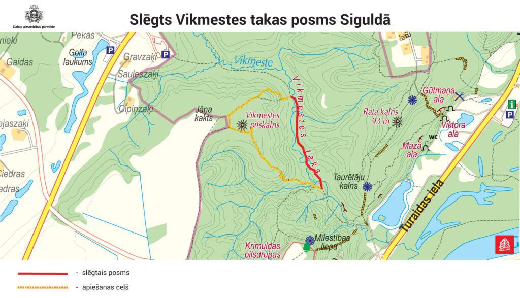 Dabas aizsardzības pārvalde (pārvalde) Gaujas Nacionālajā parkā uz laiku slēdz gājēju iecienītās Vikmestes takas posmu. Tajā starp Siguldas Gūtmaņalu un Turaidas Reiņa trasi jeb Milda-Gravzaķi ir konstatēti būtiski infrastruktūras bojājumi, tostarp tiltiņu konstrukcijās. Labošanas darbi tiks uzsākti tuvāko dienu laikā. Slēgtais posms apejams caur Vikmestes pilskalnu.