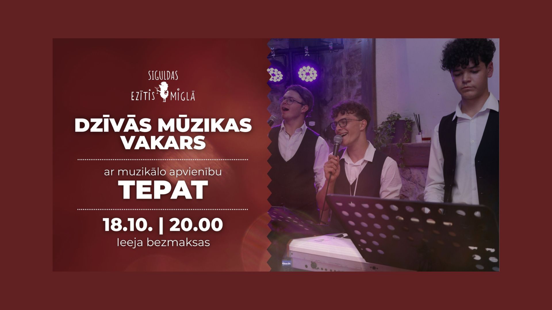 Aicini draugus, radus un savu otro pusīti. Rezervē galdiņu un ļaujies sestdienas vakara burvībai ar muzikālo apvienību “TEPAT” – sirsnīga atmosfēra, dzīvā mūzika, gardi ēdieni un dzērieni Siguldas Ezīša stilā.