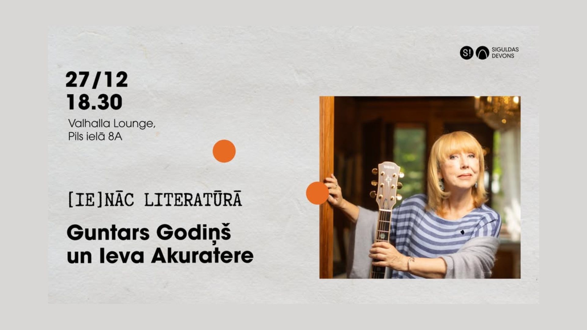 27. decembrī plkst. 18.30 Siguldas “Valhalla Lounge”, Pils ielā 8 A, notiks cikla “[Ie]nāc literatūrā” decembra saruna. Uz to Guntars Godiņš ir aicinājis dziedātāju Ievu Akurateri.