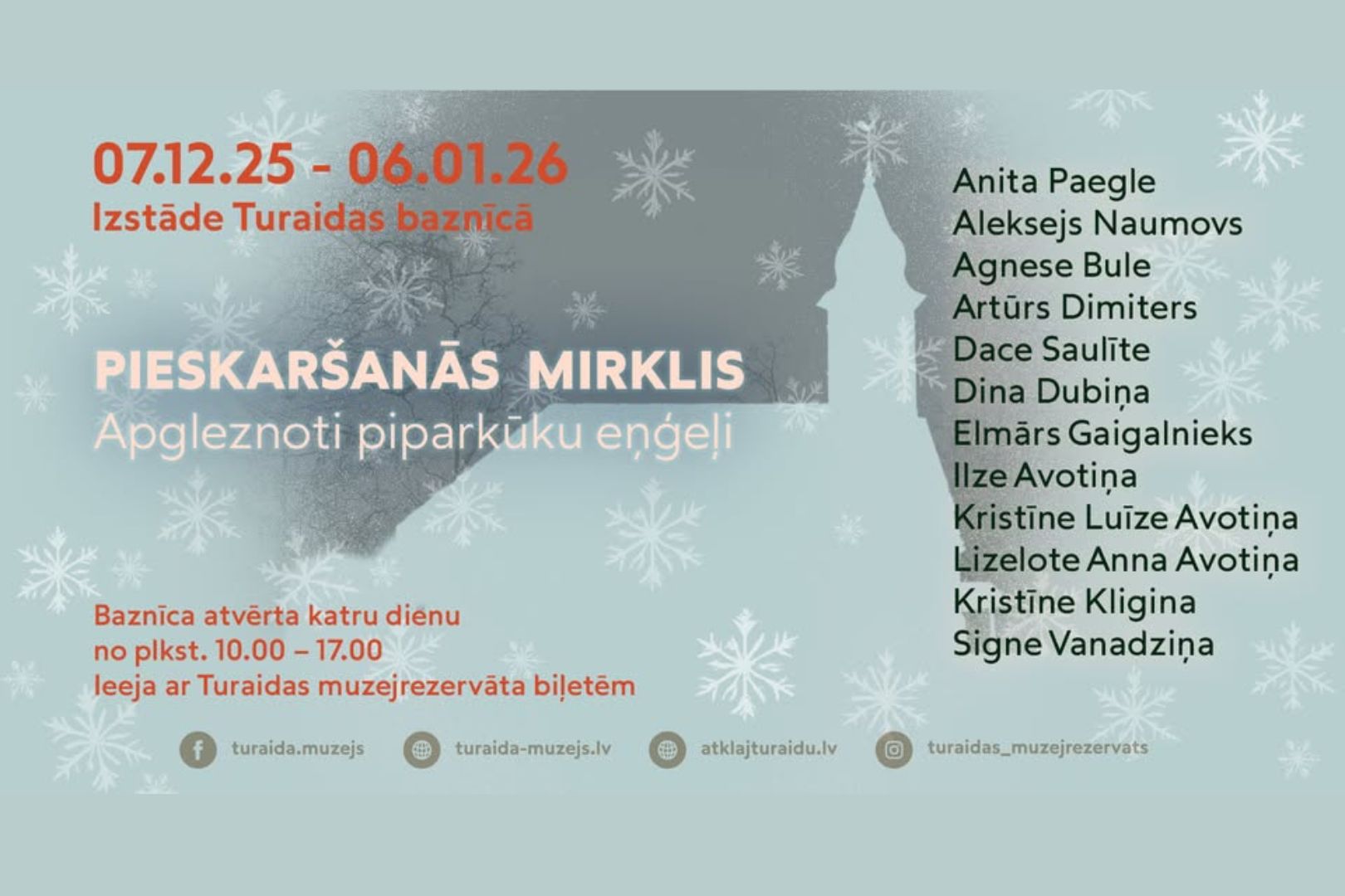 Turaidas muzejrezervāta baznīcā būs apskatāma īpaša un līdz šim nebijusi piparkūku izstāde “Pieskaršanās mirklis”. Tajā divpadsmit Latvijas mākslinieki — Anita Paegle, Aleksejs Naumovs, Ilze Avotiņa, Kristīne Luīze Avotiņa, Lizelote Anna Avotiņa, Signe Vanadziņa, Dace Saulīte, Artūrs Dimiters, Kristīne Kligina, Dina Dubiņa, Elmārs Gaigalnieks un Agnese Bule — radīs savus Ziemassvētku stāstus, apgleznojot lielizmēra piparkūku eņģeļus.