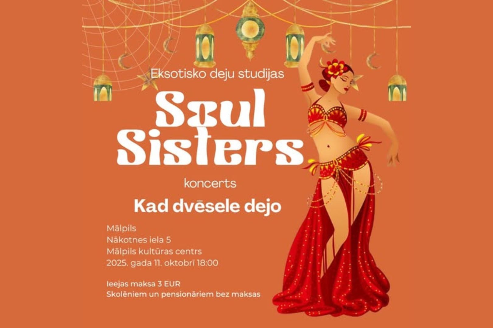 Eksotisko deju studija “Soul Sisters” (Sigulda, Latvija) aicina uz krāšņu koncertu “Kad dvēsele dejo”, kas notiks Mālpils Kultūras centrā.