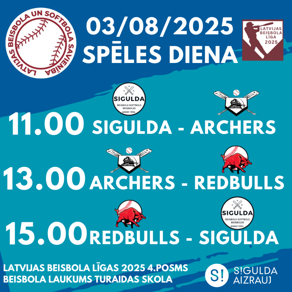 Turaidas skolas laukumā norisināsies Latvijas beisbola līgas 2025. gada sezonas ceturtais posms. Šie posmi tiek organizēti pēc sabraukuma principa, pulcējot vairākas komandas vienuviet. Šajā posmā spēkiem mērosies Rīgas komandas Archers un Red Bulls, kā arī Siguldas beisbola klubs. Pirmā spēle sāksies plkst. 11:00, kurā laukumā dosies Rīgas Archers un Siguldas komanda.