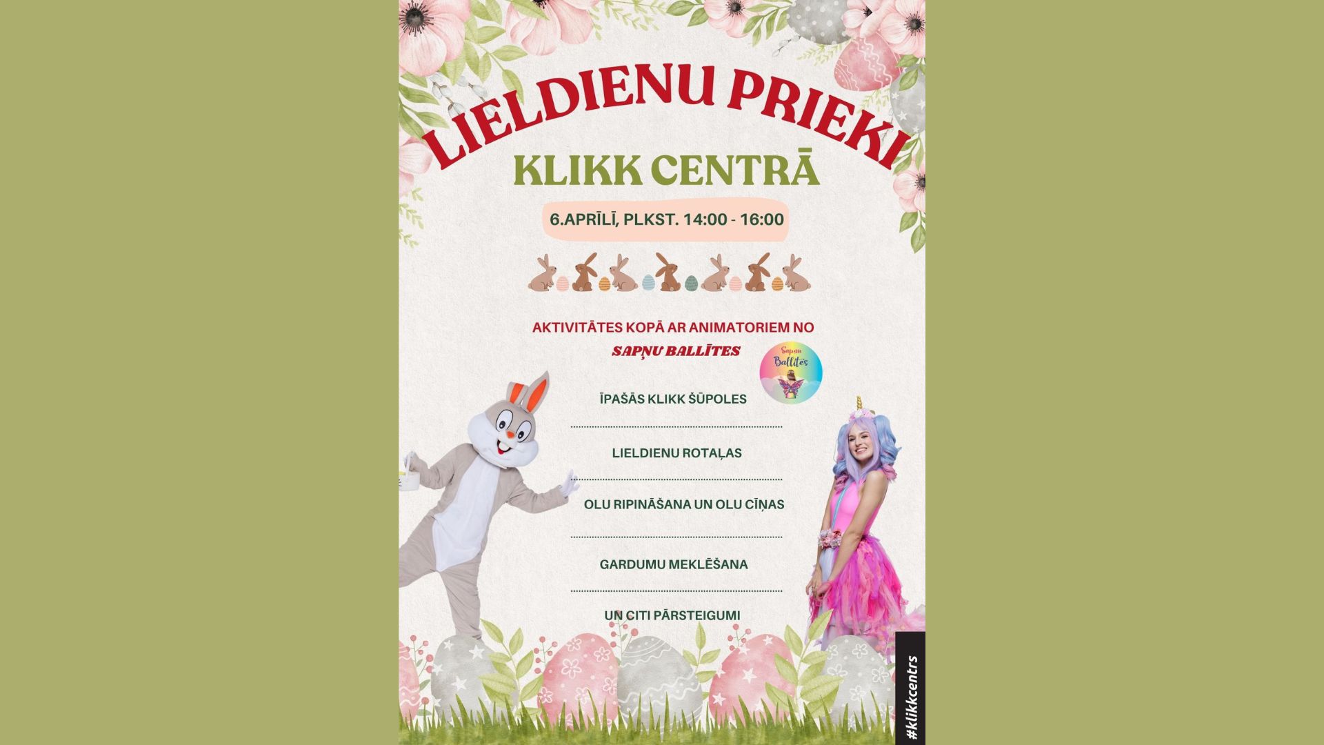6.aprīlī, otrajās Lieldienās, gaidīsim visus KLIKK centrā uz Lieldienu prieku pēcpusdienu.