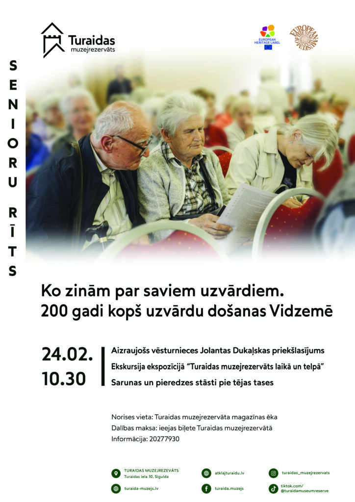 24. februārī plkst.10.30 Turaidas muzejrezervāts uzsāk jaunu tematisku programmu “Senioru rīts”, aicinot uz pirmo tikšanos, kas veltīta uzvārdu došanai – “Ko zinām par saviem uzvārdiem jeb 200 gadi kopš uzvārdu došanas Vidzemē”.