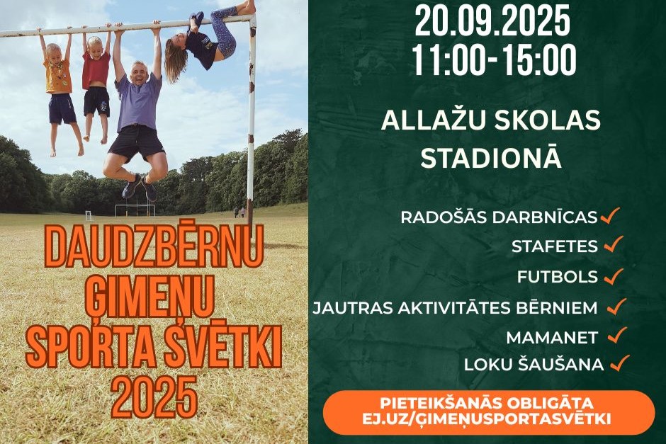 20.09.2025. no plkst. 11.00 līdz 15.00 Allažu skolas stadionā notiks Siguldas novada daudzbērnu ģimeņu sporta svētki.