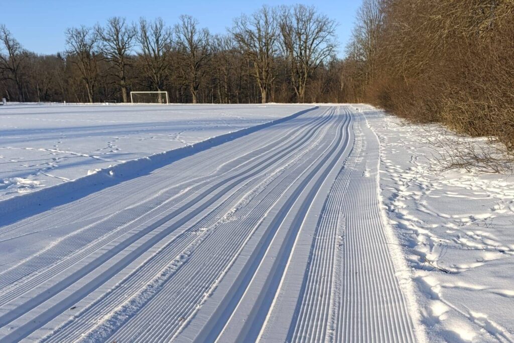 Mālpils stadiona skrejceļš ir pārtapis par slēpošanas apli. Ievilkti ir divi slēpošanas celiņi.